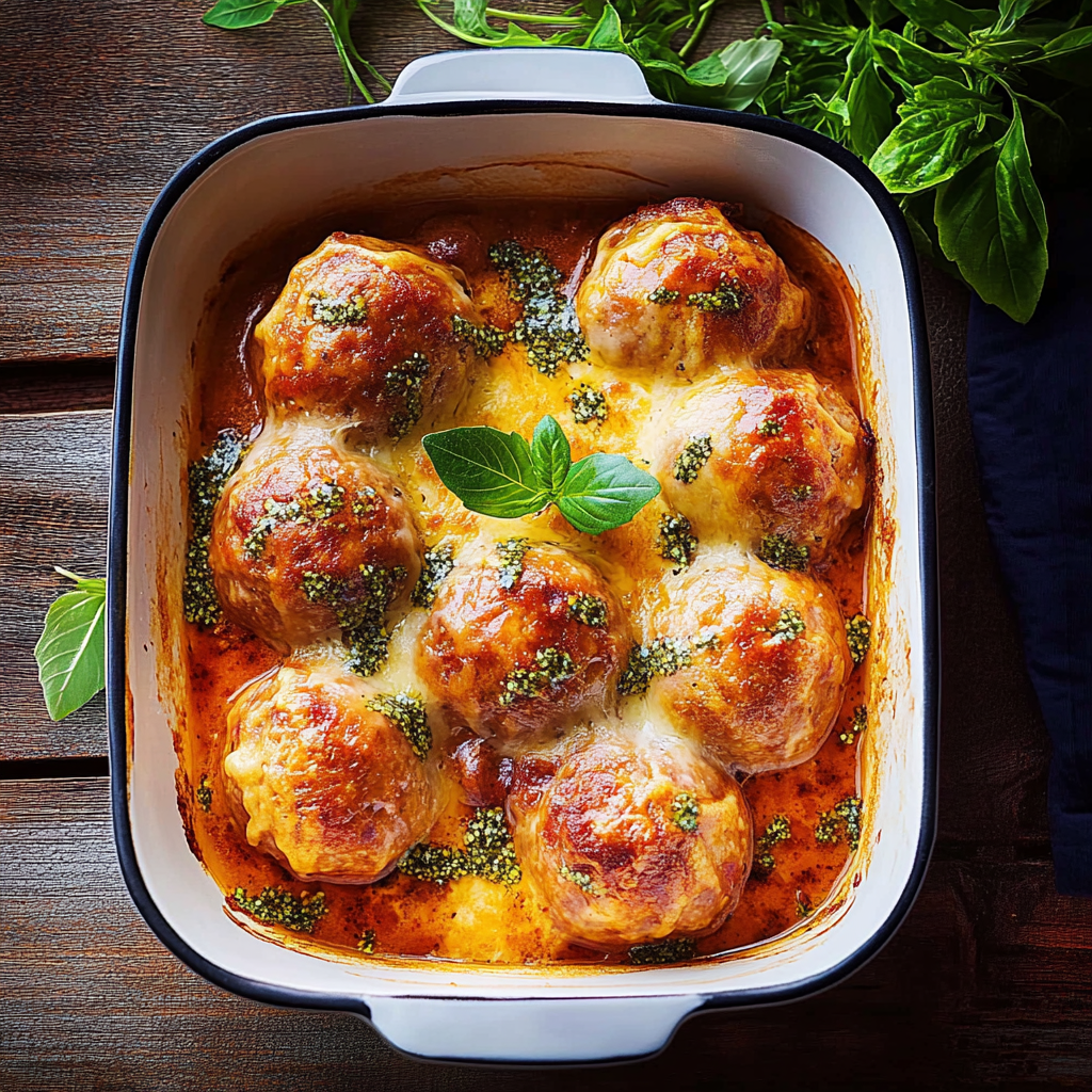 - Gieße die Sauce gleichmäßig über die geformten Hackbällchen in der Auflaufform.