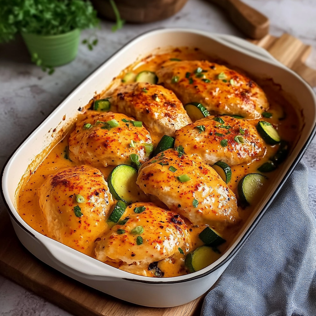 Ein einfaches, cremiges Ofengericht mit zarter Hähnchenbrust, Paprika und Zucchini in einer aromatischen Frischkäsesoße – perfekt für Anfänger.
